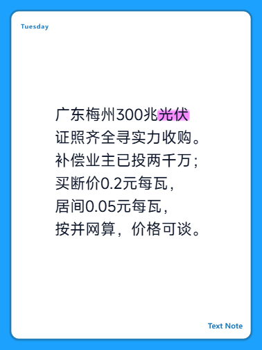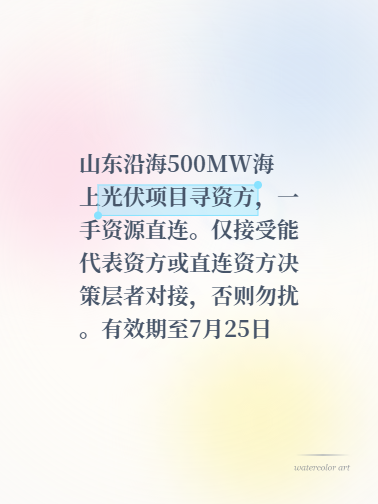 山东沿海500MW海上光伏项目寻资方,一手资源直连。仅接受能代表资方或直连资方决策层者对接,否则勿扰。有效期至7月25日