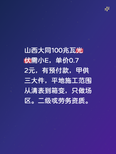 山西60MW整村户用光伏项目找大EPC,20MW一结账,由国企担保公司出保函,总价1.98,包含高压侧和0.2元业务费。