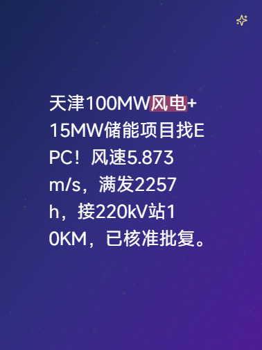 天津100MW风电+15MW储能项目找EPC!风速5.873m/s,满发2257h,接220kV站10KM,已核准批复。