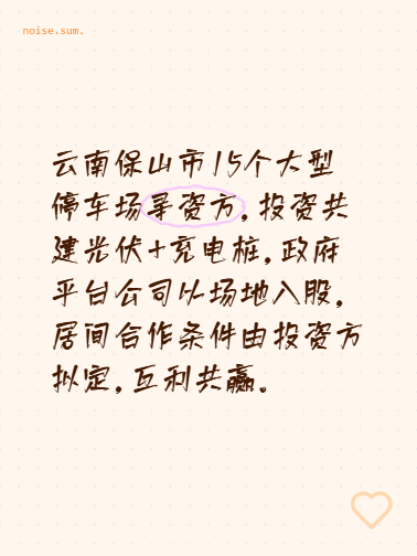 云南保山市15个大型停车场寻资方,投资共建光伏+充电桩,政府平台公司以场地入股,居间合作条件由投资方拟定,互利共赢。