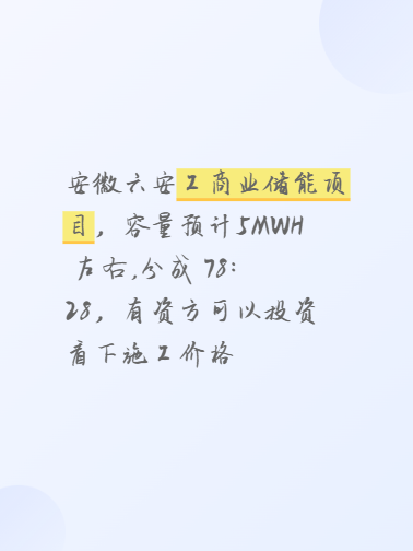 安徽六安工商业储能项目,容量预计5MWH 左右,分成 78:28,有资方可以投资看下施工价格
