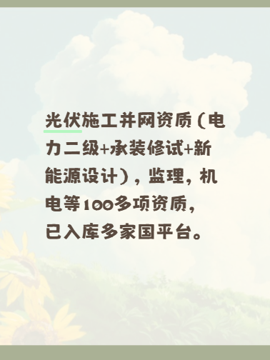 光伏施工并网资质(电力二级+承装修试+新能源设计),监理,机电等100多项资质,已入库多家国平台。