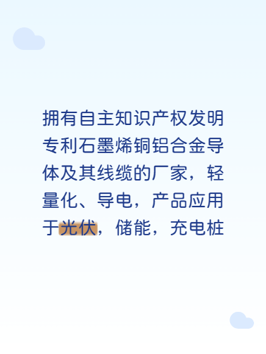 本企业拥有石墨烯碳铝共晶铜包铝导体及电缆专利。降本增效,节能。对比铜电缆降本20%。适用光伏电缆,储能电缆,充电桩等