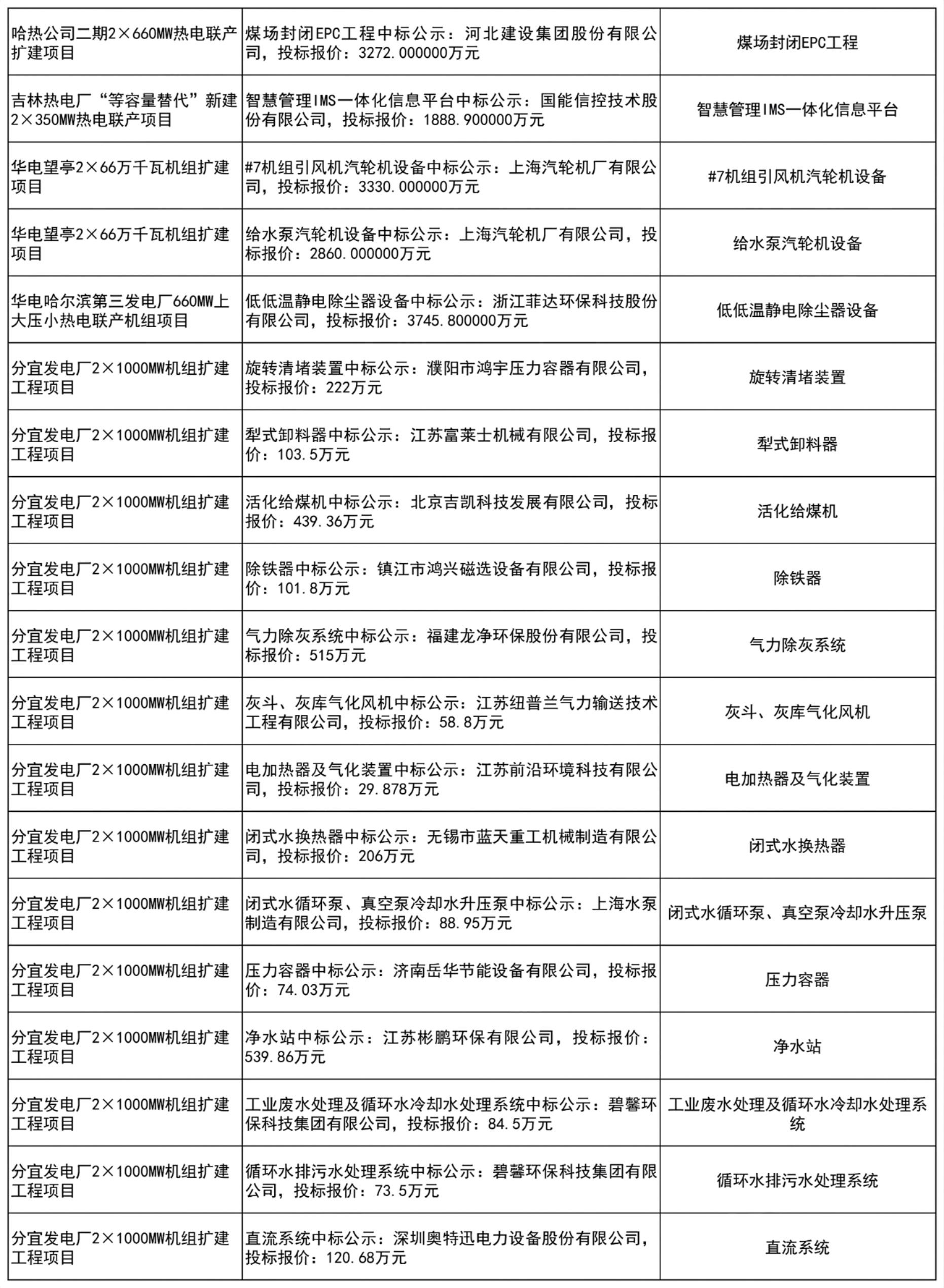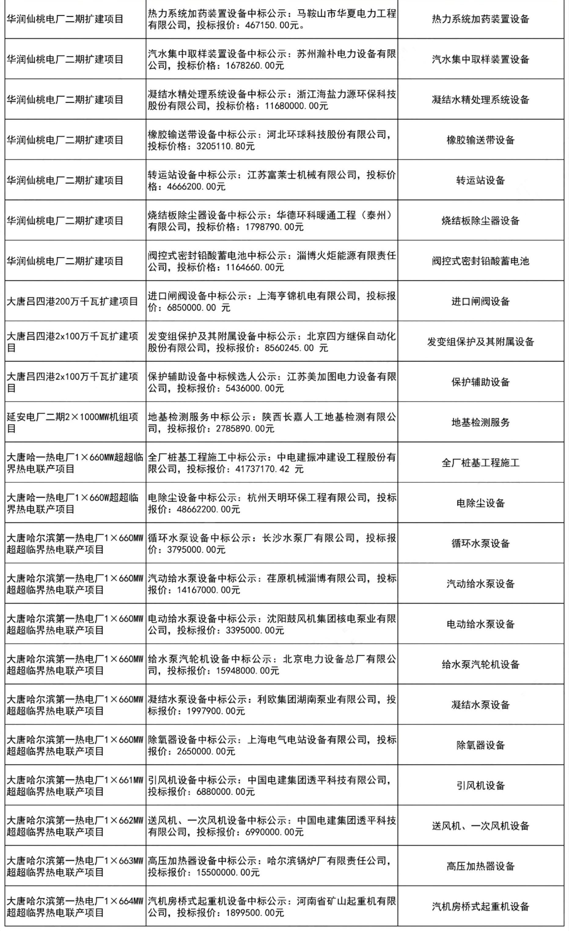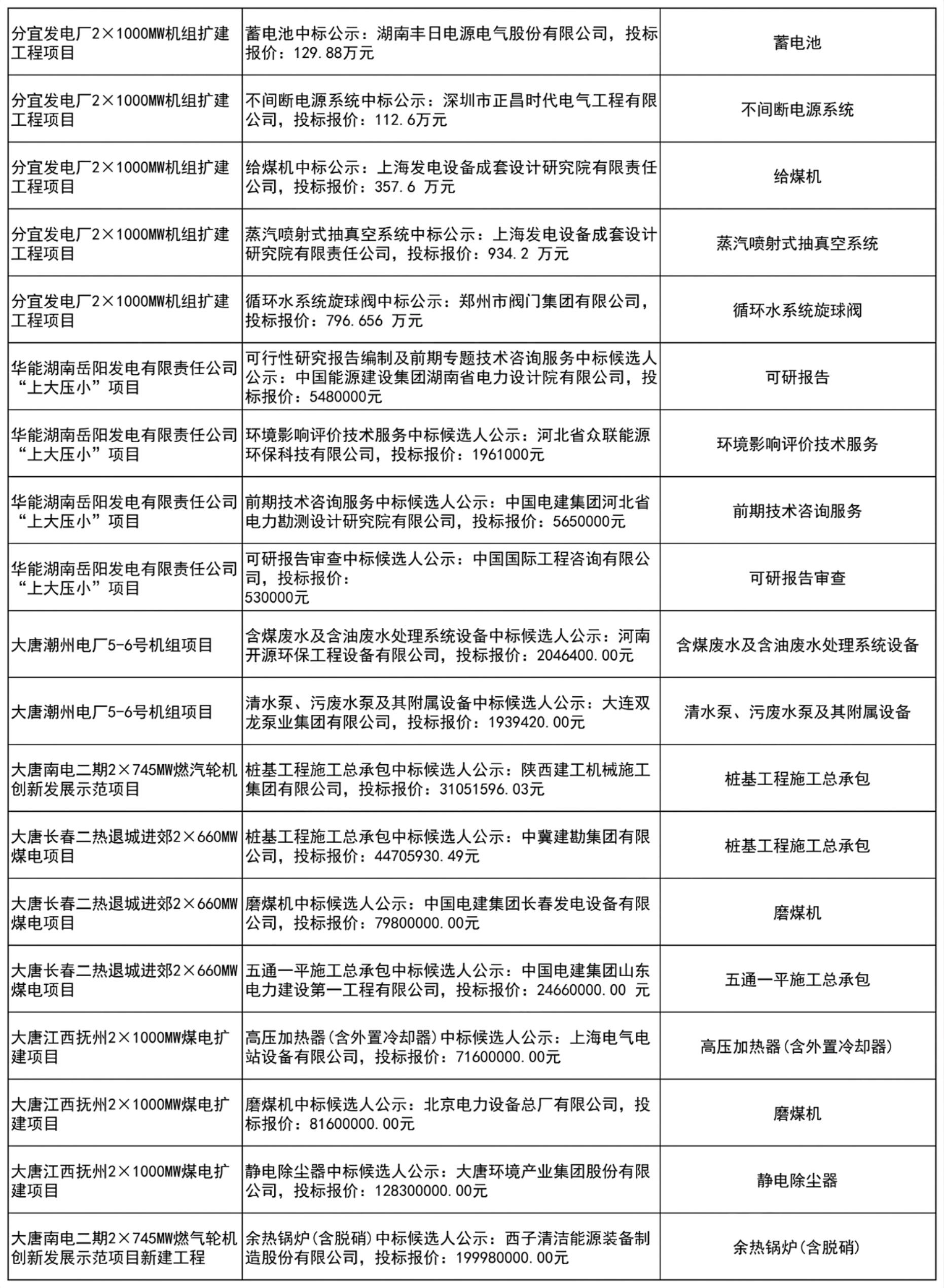 五大发电、华润集团、三峡集团近期火电项目相关的86项中标候选人公示