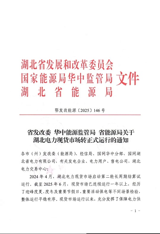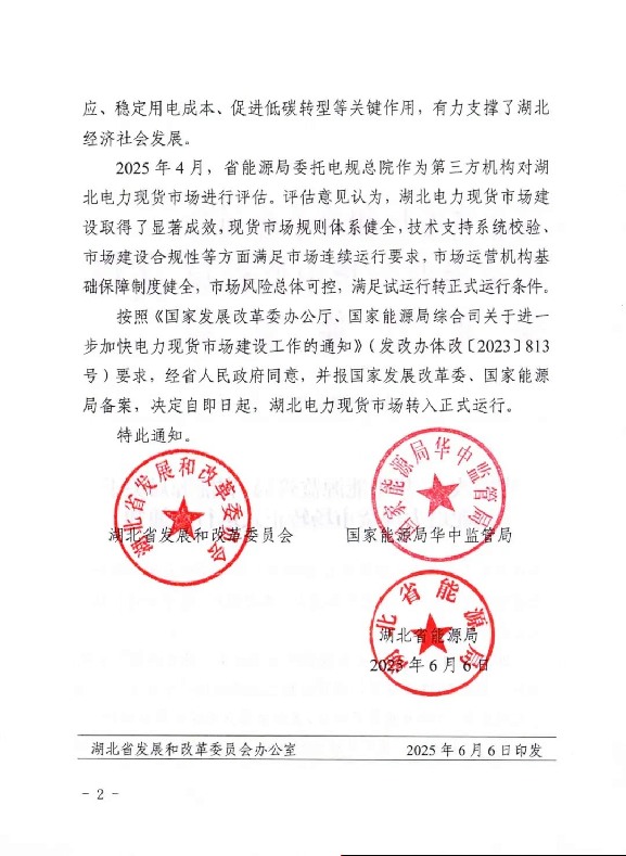 文件明确,按照《国家发展改革委办公厅、国家能源局综合司关于进一步加快电力现货市场建设工作的通知》要求,经省人民政府同意,并报国家发展改革委、国家能源局备案,决定自即日起,湖北电力现货市场转入正式运行。