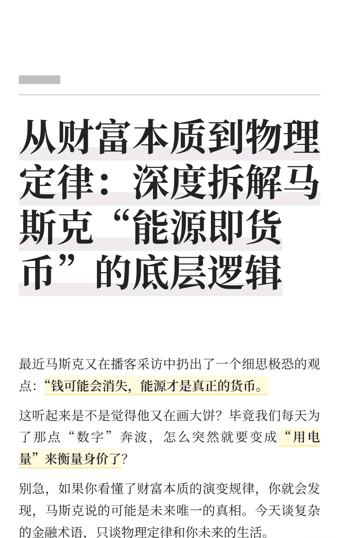 马斯克认为能源即货币,指能源可像货币一样流通交易,风电水电作为清洁能源,通过发电产生价值,可替代传统货币进行能源交换与经济活动,推动绿色经济循环