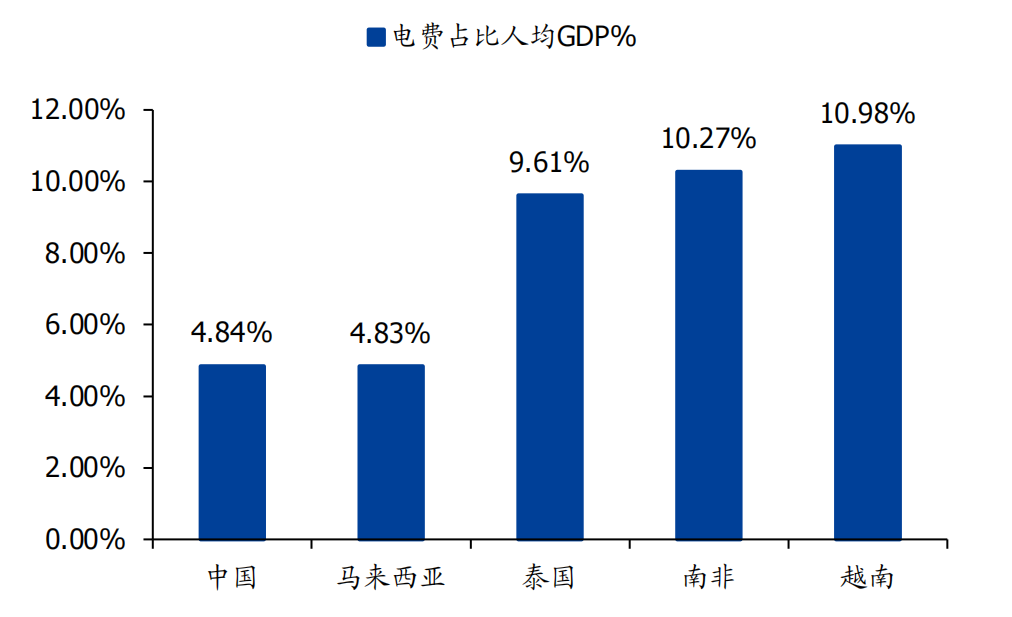 尽管东南亚电价绝对值不高,但其“电费痛苦指数”(电费占人均GDP比重)显著高于中国。越南的这一指标达到11.0%,泰国为9.6%,而中国约为4.8%。这意味着当地企业承受的电费压力远超中国同行。
