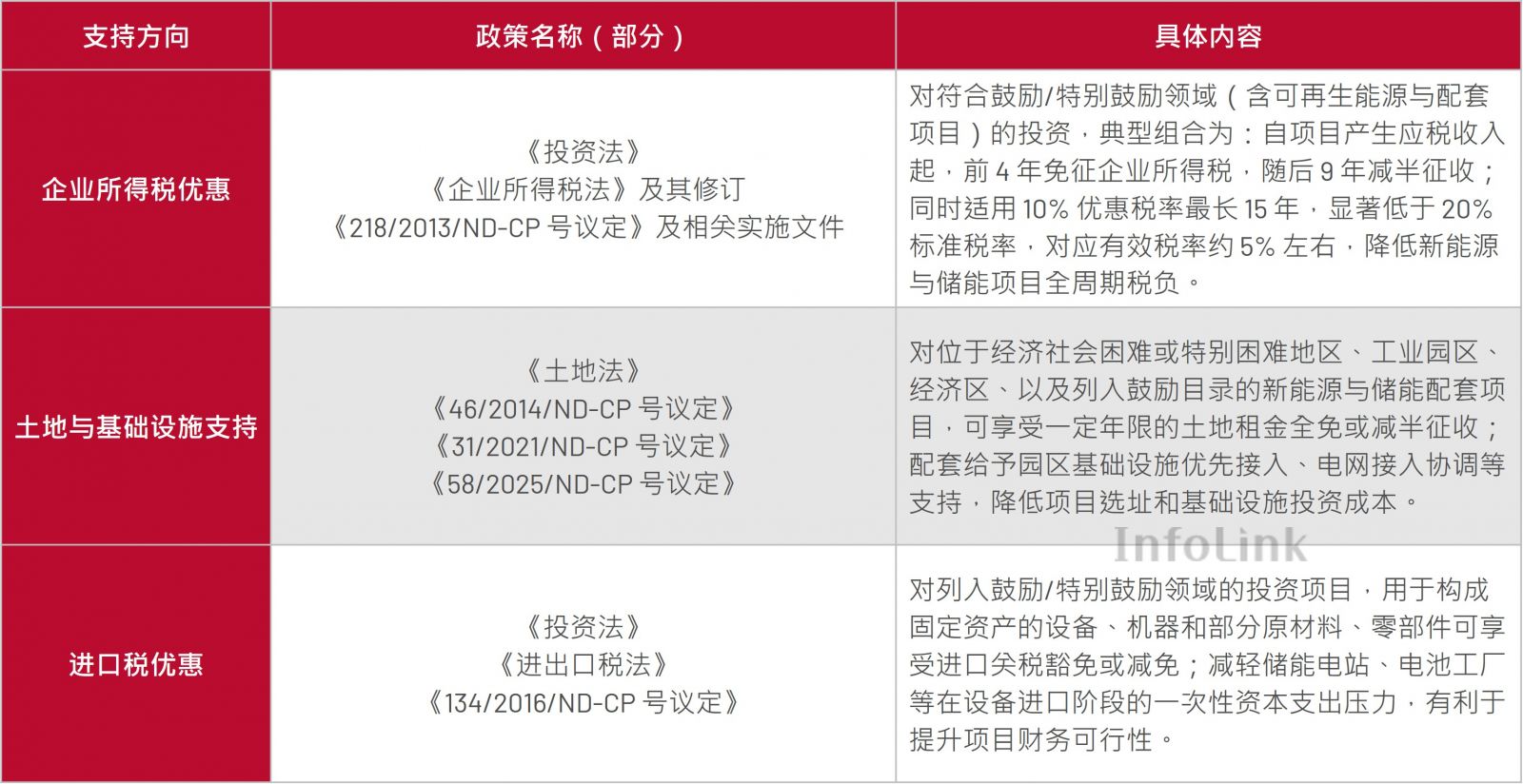在价格机制之外,越南对可再生能源及相关配套项目(包括储能)适用通用的投资优惠政策体系。政策支持方向涵盖企业所得税优惠,土地与基础设施支持,进口税优惠等方向: