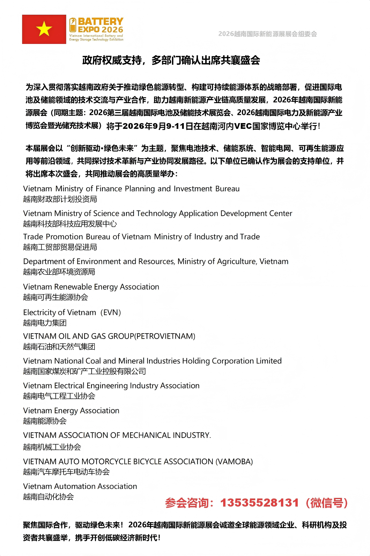 2026越南新能源展暨电池及储能光伏展(Vietnam New Energy Expo 2026)!