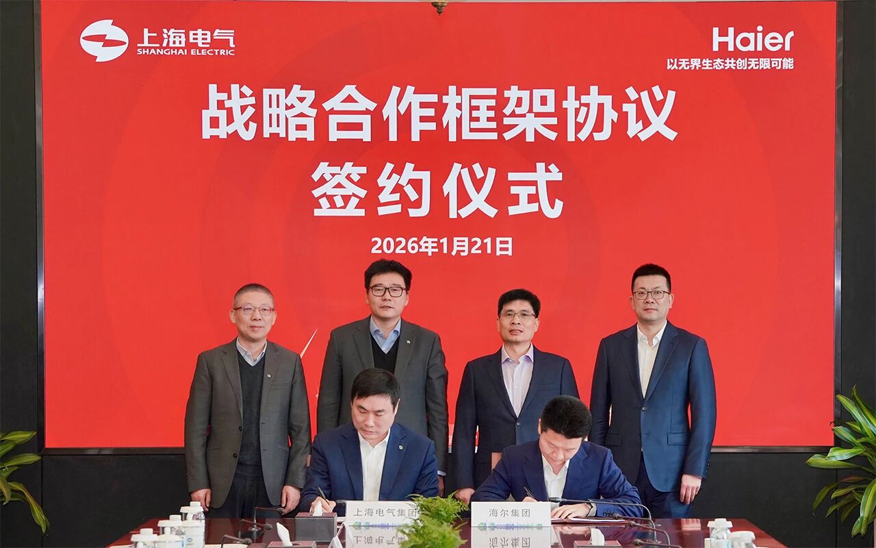 1月21日,在上海电气集团党委书记、董事长吴磊与海尔集团党委书记、董事局主席、首席执行官周云杰的共同见证下,上海电气与海尔集团签署战略合作协议。双方围绕新能源、工业互联网、产业链协同、国际化布局等议题进行深入交流。上海电气集团党委副书记、总裁朱兆开,海尔集团副总裁、政企事务总经理、海尔智家中国区总经理赵弇锋出席。