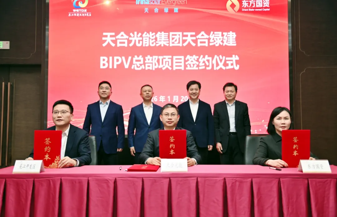 1月20日,天合光能与苏州市吴江区举行签约仪式,共同推进天合绿建项目在吴江开发区的实施。吴江区委书记孙建江,天合光能董事长高纪凡出席仪式并见证签约。